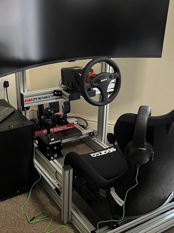 A hybrid version of the Caterham simulator for custom with specific requirements such as the Simucube Sport wheel base and Formula steering wheel. Located in Kent.